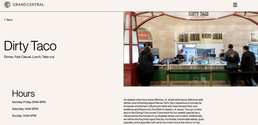 When I visited Grand Central I went to Dirty Taco to try some of their offerings. Overall I enjoyed the tacos and felt that they were flavorful and tasty. The price of the tacos was above average however given the location it was not a surprise to me.